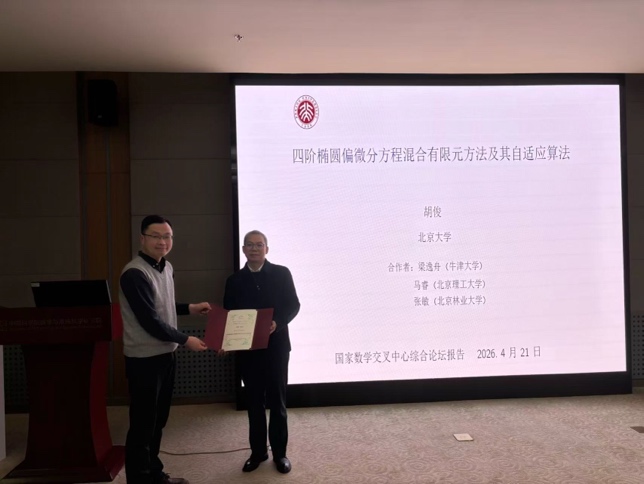 2026年4月21日上午,北京大学数学科学学院的胡俊教授应国家数学与交叉科学中心邀请做客综合论坛,并做了题为“四阶椭圆偏微分方程混合有限元及其自适应算法”的学术报告。许现民研究员主持了报告,并在报告后给胡俊教授颁发了杰出讲座证书。